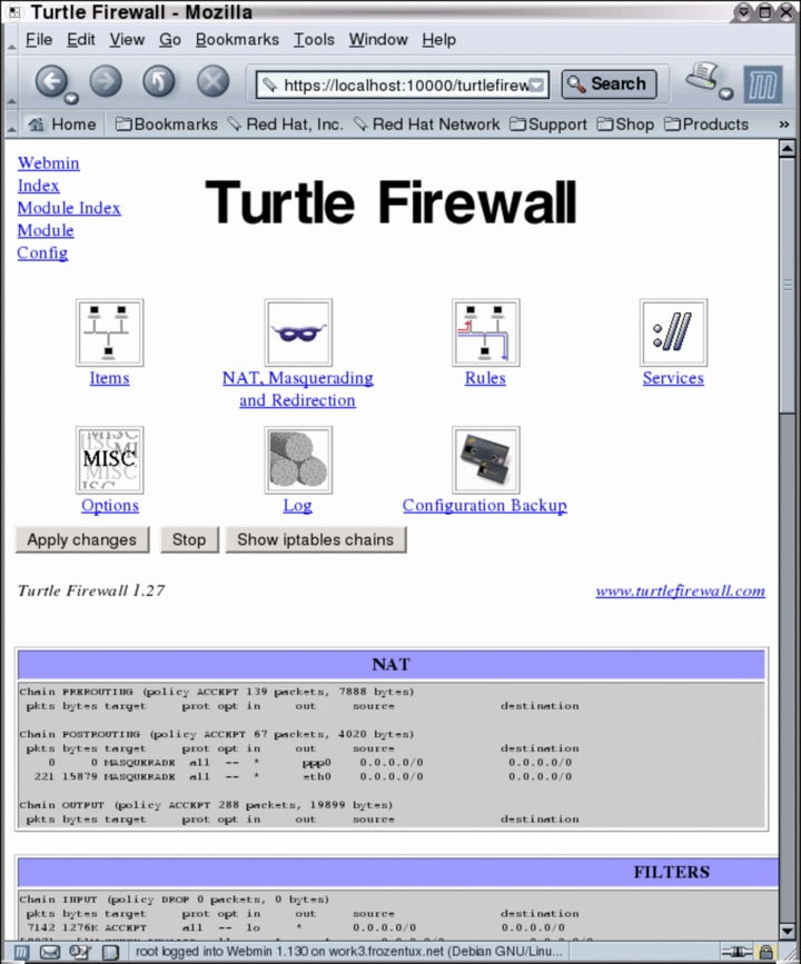 Turtle Firewall is an excellent, yet simpler kind of user interface to iptables. It is integrated in something called webmin (a web administration interface). It is fairly basic, and neither as complex nor able to handle as complex changes as the fwbuilder package, but it is more than able to handle most simpler firewalls, as well as some more advanced ones as well.